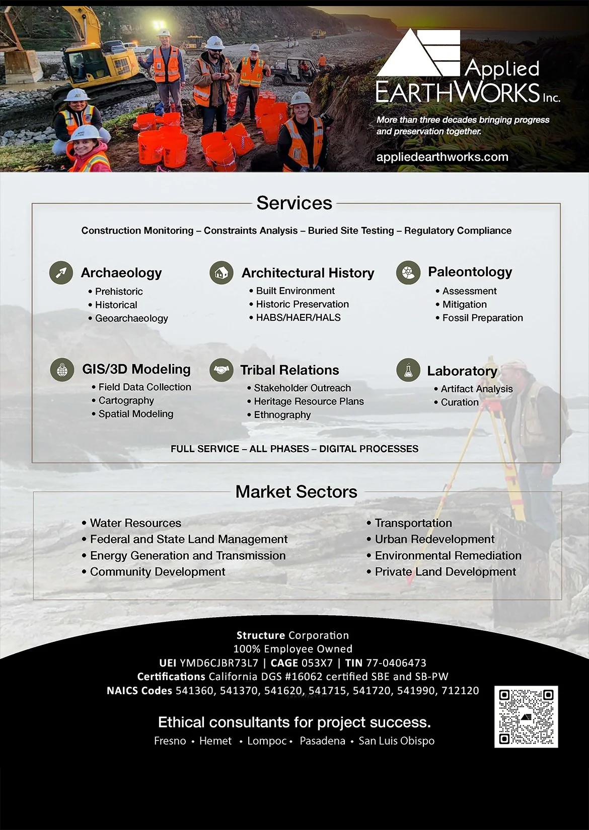 Applied EarthWorks staff are consistently recognized for their expertise in archaeology, paleontology, and the regulatory context under which we work.